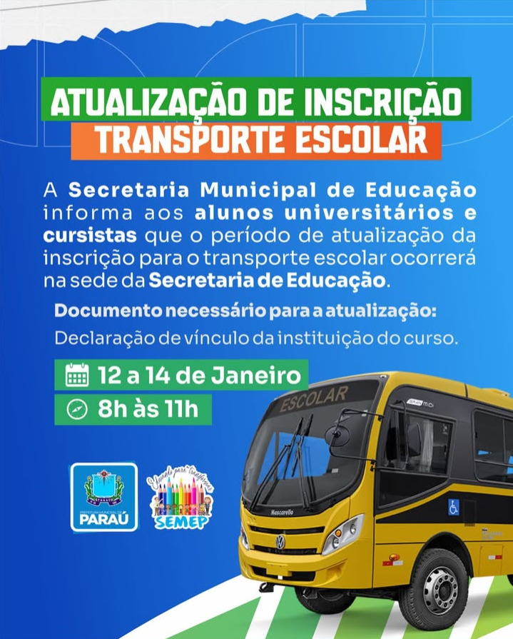 A Secretaria Municipal de Educação, informa aos alunos universitários e cursistas que o período de atualização da inscrição para o transporte escolar …